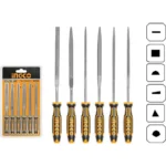 | 6pcs File set Length:140mm Diameter:3mm Flat,Round,Half round,Square,Triangle,Knife With two color handle Packed by double blister |