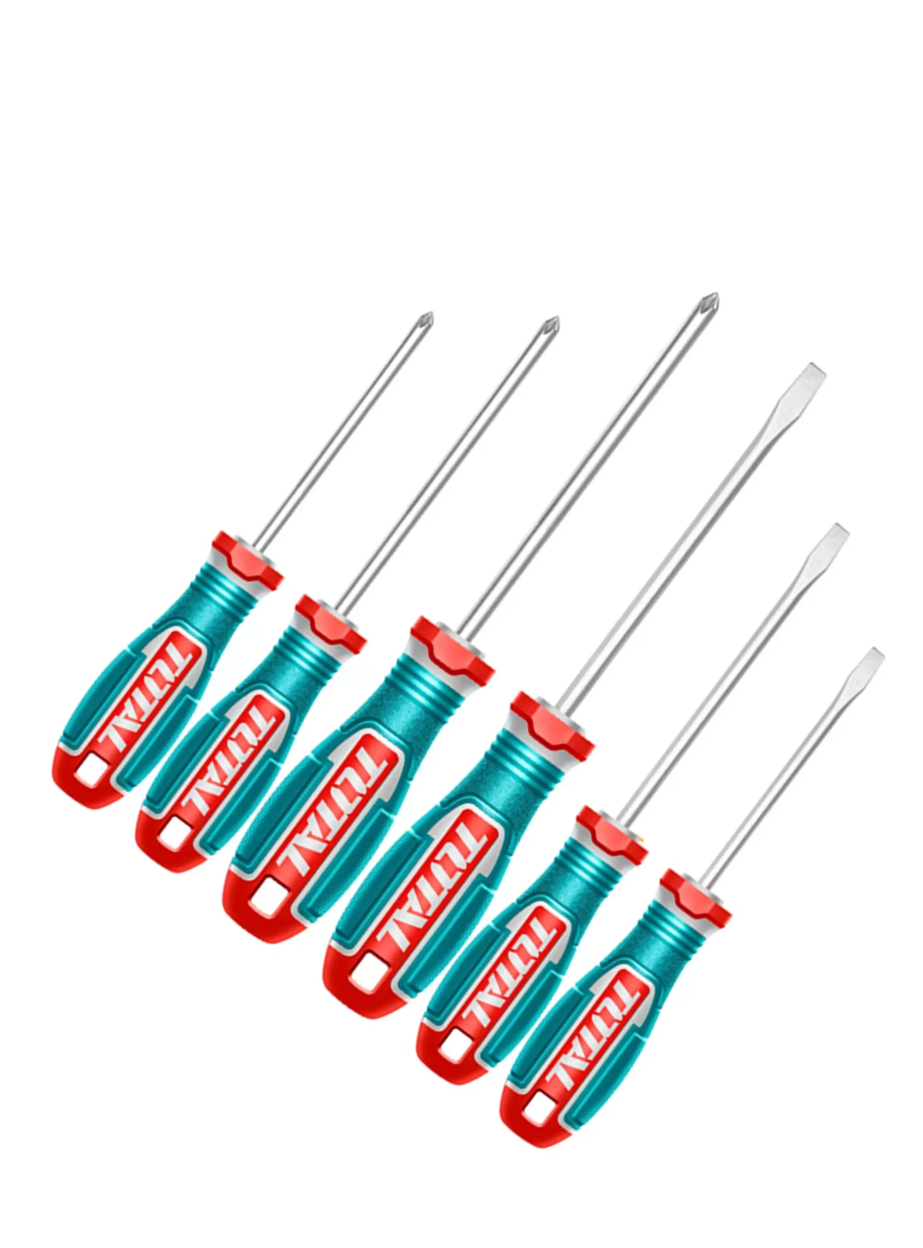 | 6pcs screwdriver set Blade material: S2 Shank type: round 1Pcs SL5.5*5*75mm 1Pcs PH1*5*75mm 1Pcs SL5.5*5*100mm 1Pcs PH1*5*100mm 1Pcs SL6.5*6*150mm 1Pcs PH2*6*150mm Handle material: three-color ergonomic With strong magnetic Packed by double blister |