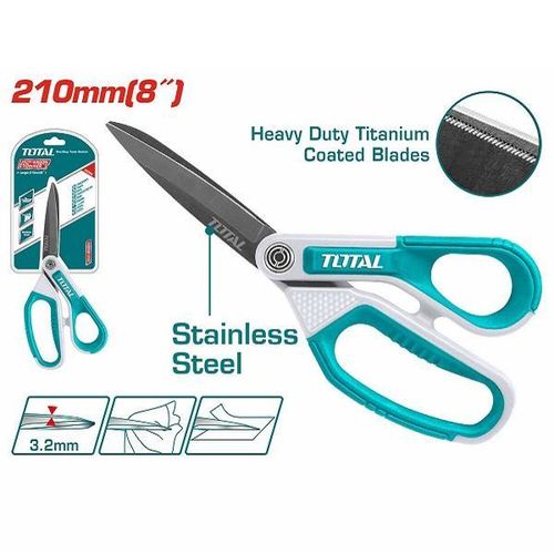 | Size:210mm(8″) Material:Titanium plated stainless steel Blade thickness:3.2mm Especially suitable For fabric/plastic/cardbroad Unique design handle Long edge titanium plated stainless steel blade Good at lightweight fabrics, plastics or paperboard Packed by blister card |